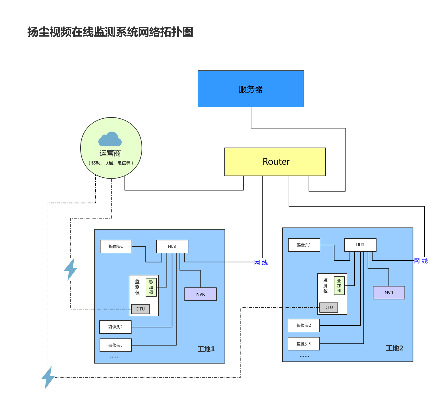下圖為揚(yáng)塵視頻在線監(jiān)測(cè)系統(tǒng)網(wǎng)絡(luò)拓?fù)浼軜?gòu)框圖: