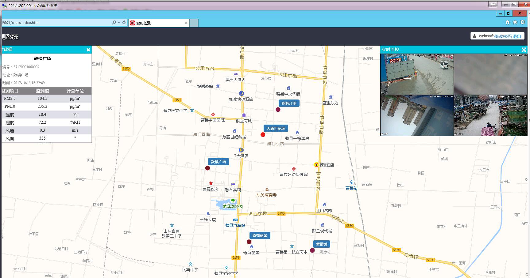 通過(guò)系統(tǒng)首頁(yè)左側(cè)主菜單可以查看到系統(tǒng)實(shí)時(shí)監(jiān)測(cè)的數(shù)據(jù)信息,利用GIS地圖位置呈現(xiàn)功能,可結(jié)合電子地圖確切的知道每個(gè)設(shè)備所在位置,通過(guò)點(diǎn)擊地圖上的設(shè)備圖標(biāo)可查看設(shè)備所配備各項(xiàng)傳感器采集的實(shí)時(shí)監(jiān)測(cè)因子,包括顆粒物、氣象參數(shù)、視頻等,雙擊視頻播放界面可以實(shí)現(xiàn)放大或縮小,方便用戶直觀查看區(qū)域內(nèi)所有監(jiān)測(cè)點(diǎn)的部署情況和環(huán)境質(zhì)量狀況,實(shí)現(xiàn)了實(shí)時(shí),遠(yuǎn)程,自動(dòng)監(jiān)控顆粒物濃度以及現(xiàn)場(chǎng)視頻、圖像的采集功能,而且還具有視頻揚(yáng)塵疊加功能。